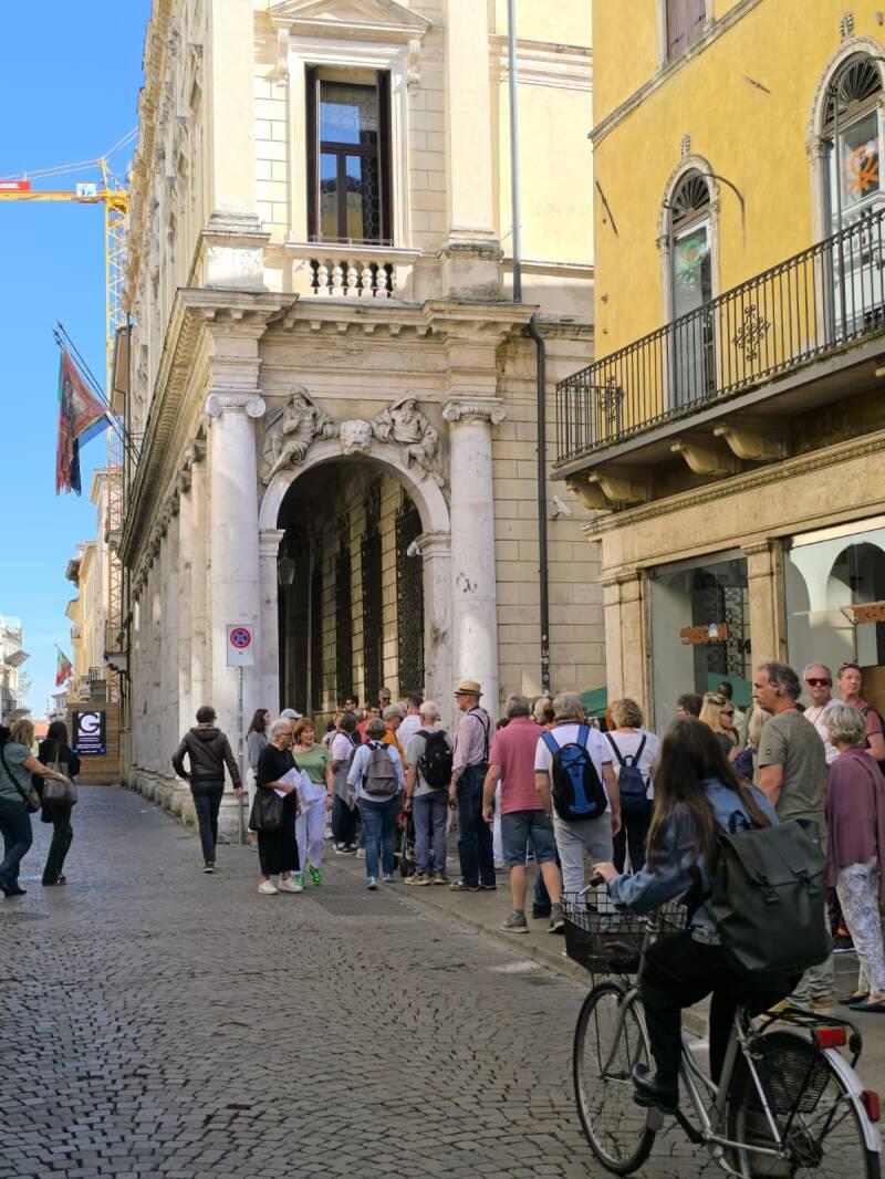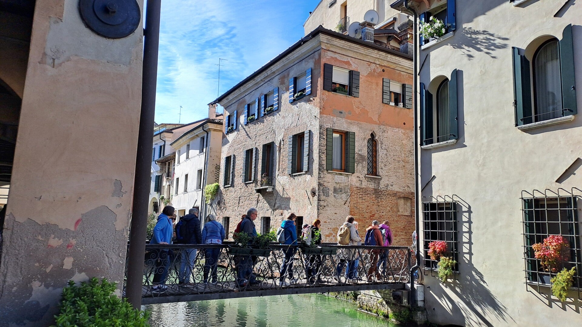 Der dritte Tag fuhren wir nach Vicenza. In der Wallfahrtskirche auf dem Monte Berico stellten wir uns natürlich wieder spontan auf und sangen zwei sakrale Werke. Danach erwartete uns eine Stadtführung auf den Spuren des berühmten Architekten Andrea Palladio. Zwischen den historischen Fassaden spürte man, warum Vicenza zum UNESCO-Weltkulturerbe gehört. Bei einem Cappuccino auf der Piazza genossen viele von uns die entspannte Atmosphäre. Den Nachmittag verbrachten wir in Bassano del Grappa, malerisch am Fluss Brenta gelegen. Die berühmte Holzbrücke Ponte degli Alpini, das Rauschen des Wassers und der Blick auf die Alpen im Hintergrund – all das ergab ein stimmungsvolles Bild. Natürlich durfte ein Besuch in einer Grappa-Destillerie nicht fehlen. Wir kosteten verschiedene Sorten und stießen auf das italienische Lebensgefühl an. Abends aßen wir ein hervorragendes 4-Gänge-Menü mit Prosecco und Wein auf einem Landgut in Valdobbiadene.