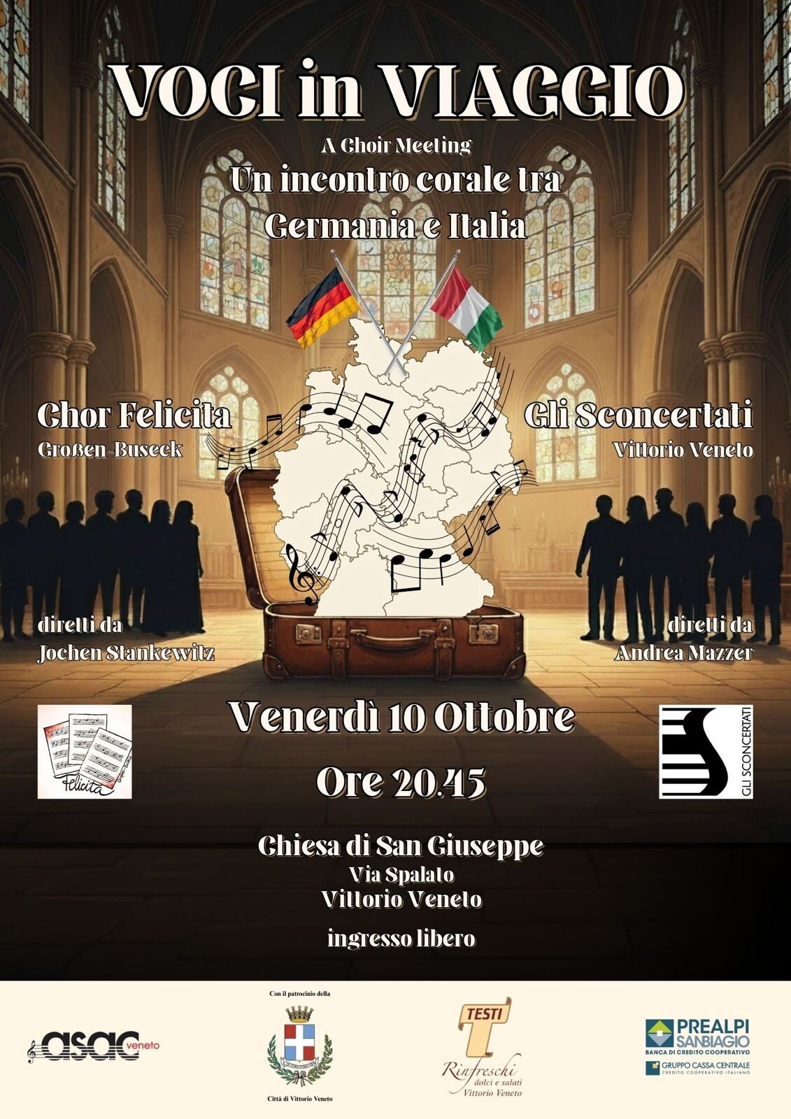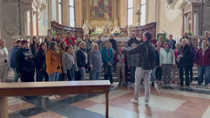 Am späten Nachmittag fuhren wir zu unserem Konzert nach Vittorio Veneto in die Kirche Chiesa di San Guiseppe. Es blieb nach dem Einsingen noch Zeit zum Umziehen und dem ersten Kennenlernen der Chormitglieder von Gli Sconcertati. Das Konzert war sehr gut besucht und wir gestalteten den ersten Teil. Martina Herzberger hatte für jedes Stück unseres alle Genres umfassenden Repertoires eine sehr einfühlsame Einführung verfasst, die auf deutsch und italienisch vorgetragen wurde. Das Publikum war sehr aufmerksam und sparte nicht mit Applaus für unsere Darbietungen. Im zweiten Teil sang der Chor Gli Sconcertati meisterhaft ihre vorgetragenen Stücke, oft mit Solopartien und mit Schlagzeugbegleitung. Zum Abschluss des Konzertes sangen beide Chöre gemeinsam, ein großes Erlebnis mit 70 Sängern und Sängerinnen. Gli Sconcertati hat das Konzert aufgezeichnet, es ist unter https://youtu.be/4HghDCeE8-o?si=K5JEdWu2VdiLJE8U abrufbar.